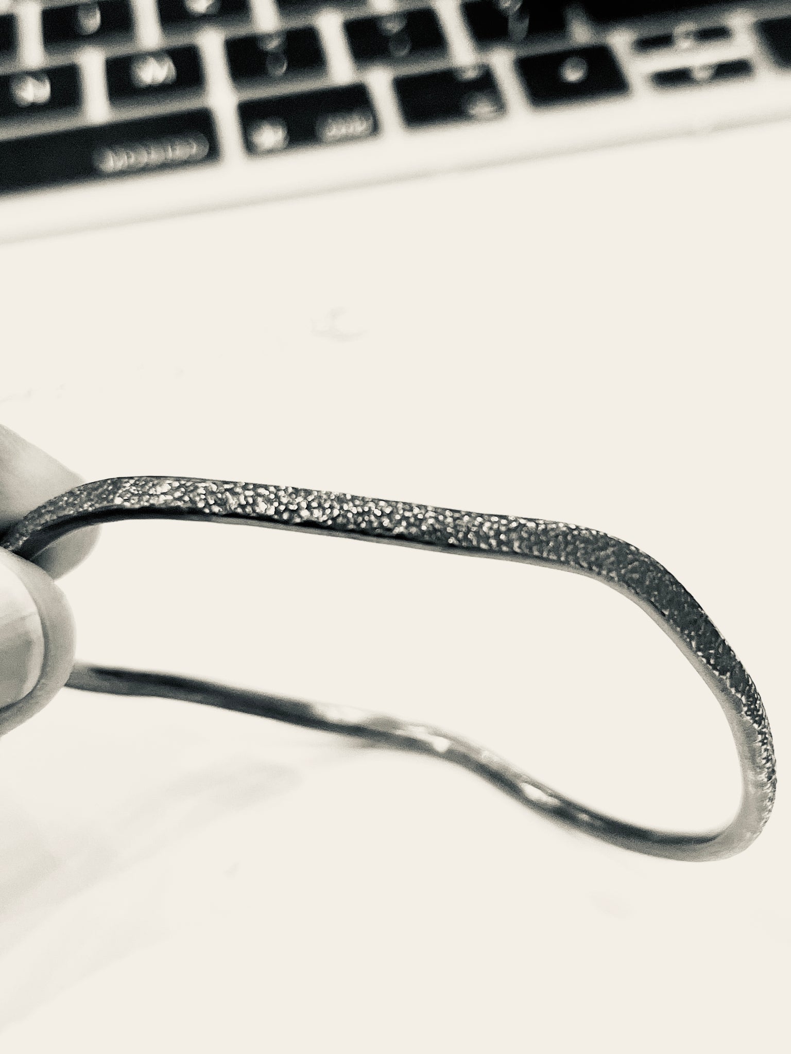 A sleek and sculptural bangle handmade in Sheffield by Adele Taylor. Crafted from solid oxidised sterling silver, this 3 mm thick bangle (7 cm diameter) features a lightly hammered texture on the outside and a smooth polished interior for comfort. Minimal and modern, it’s perfect worn alone or stacked with other silver bangles for a layered look.