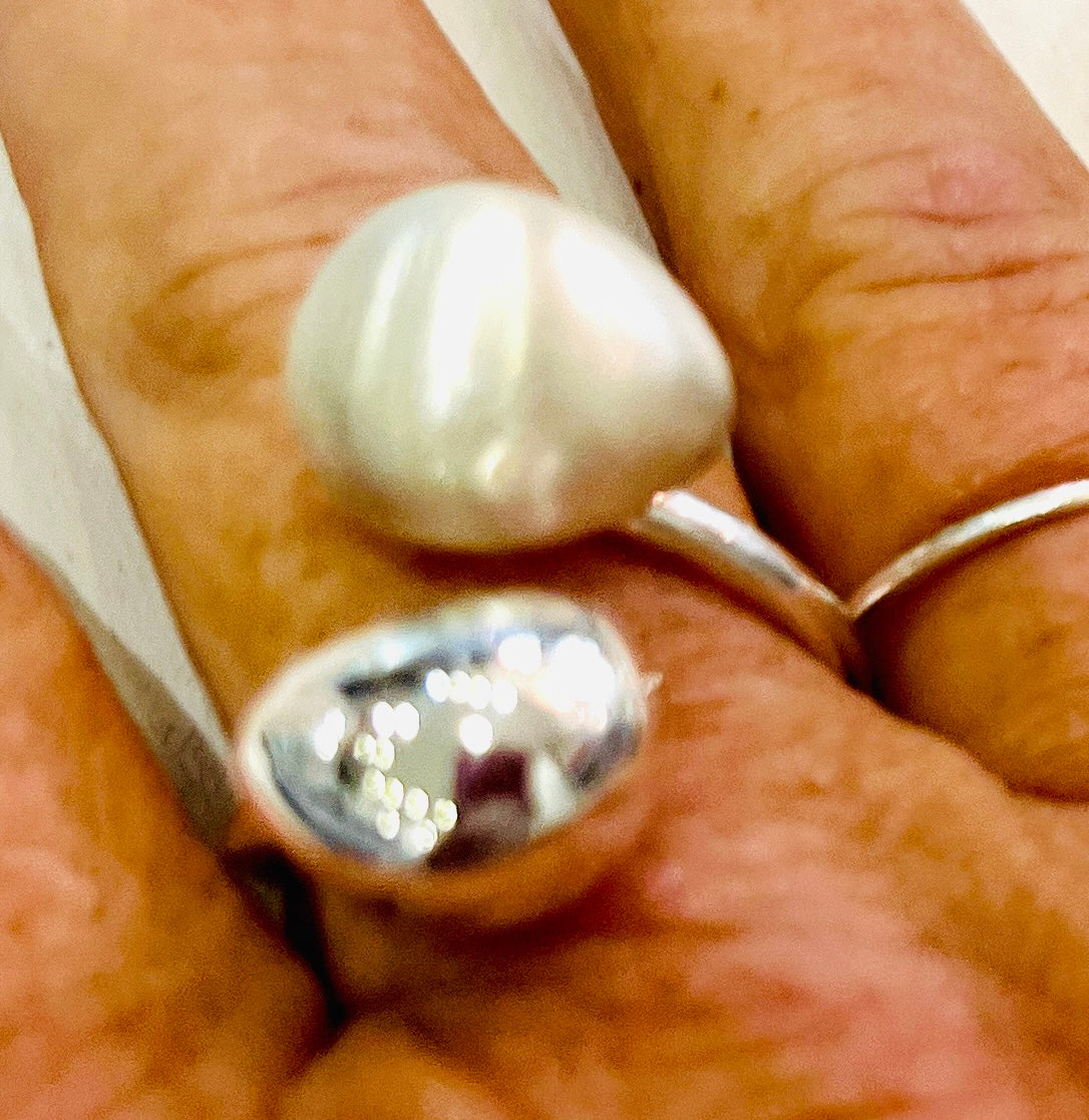 Handcrafted in solid sterling silver, the open design features two rounded “stone” forms — one polished and one softly matt-textured — creating a beautiful contrast of light and finish.