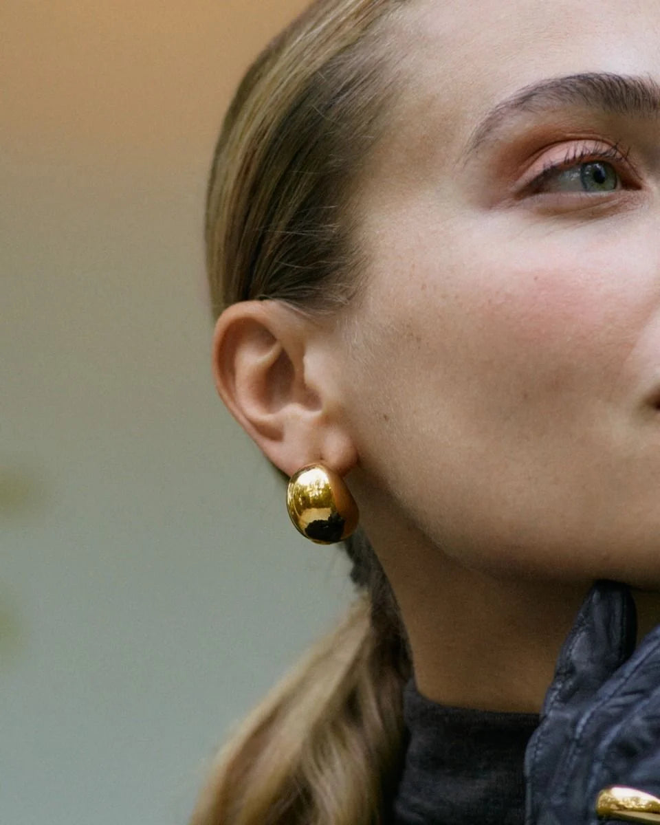 Bold is a pair of sizeable, wonderfully generous creoles that are highly sought after. Seen here in a larger variation, Bold can be worn daily and will quickly become a staple favourite. Bold creoles are hollow which makes them light and easy to wear, seen here in shiny 14K gold plating.