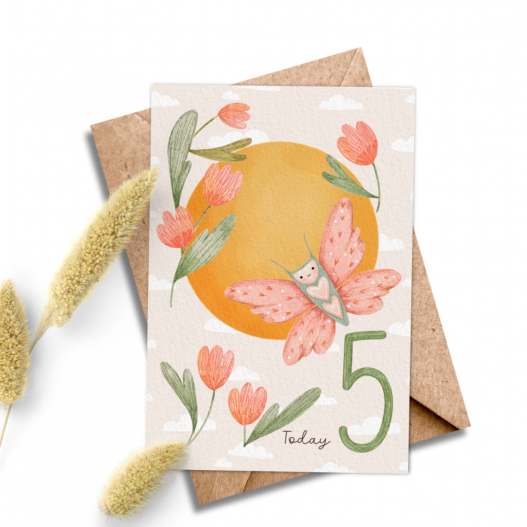 A cheerful, cute-style little butterfly flying amongst flowers and around the sun. Blank inside for your personal message. This design, with its big, joyful number and soft palette, perfectly captures the magic of turning 5! Features: Eco-Friendly Packaging: Each card comes with a 100% recycled kraft envelope, packaged in a recyclable cello bag or without a bag—your choice! Sustainable Printing: Our cards are sustainably sourced and printed on demand, reflecting our commitment to reducing environmental impact. Recyclable Materials: The card and its packaging are designed to be recyclable, making it a guilt-free choice for gift-giving. Batch Sales: Each greeting card is sold in convenient batches of six.