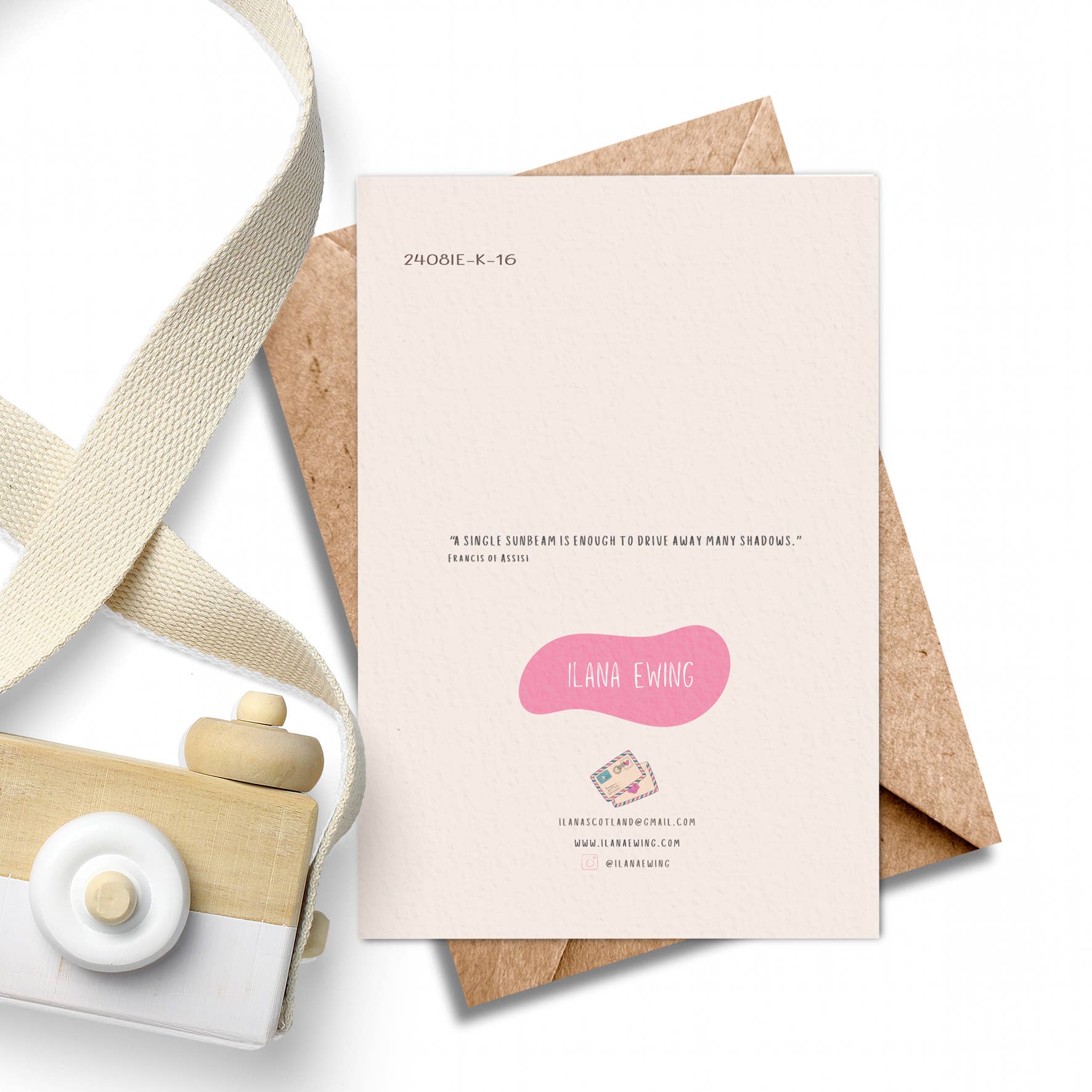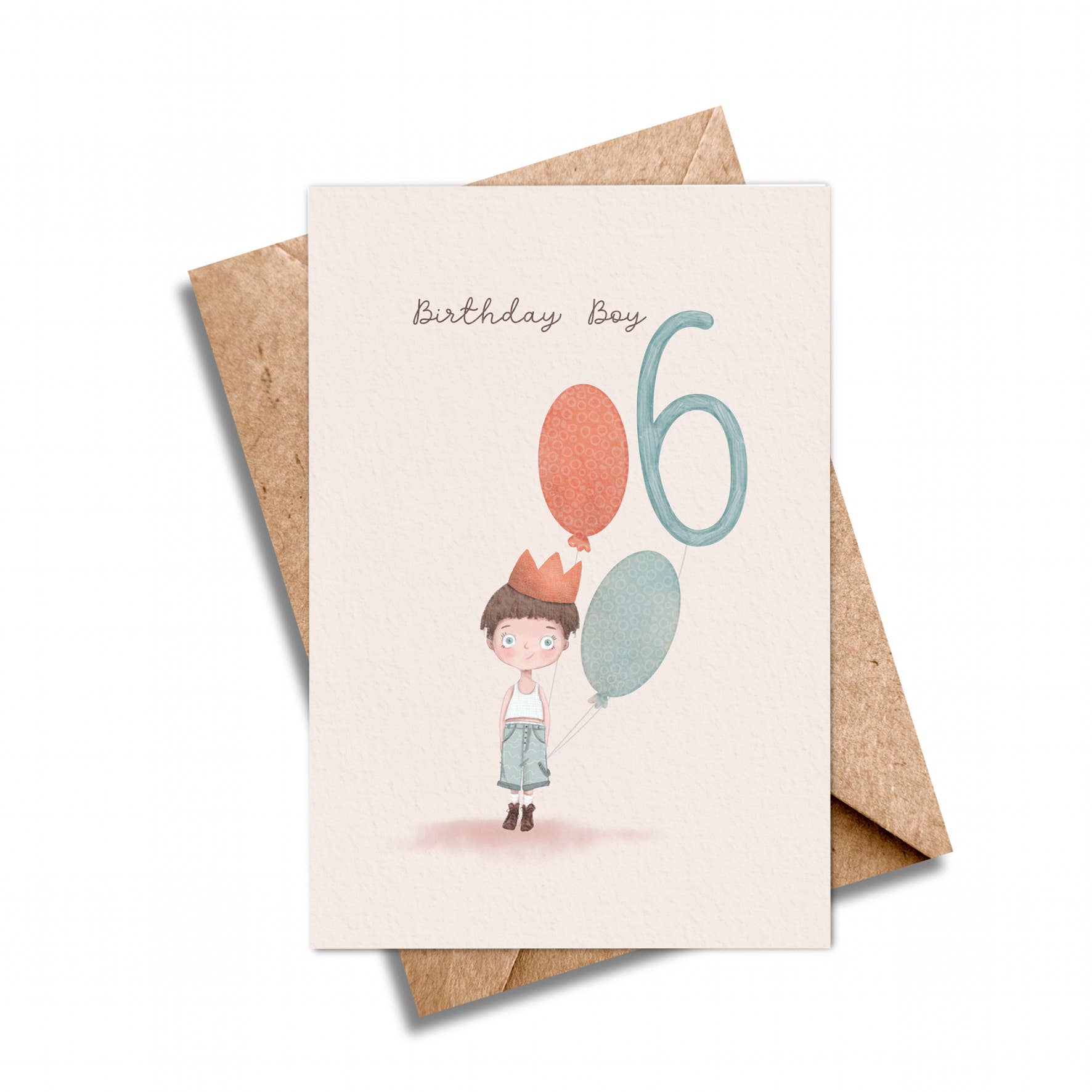 This card features a cute little boy holding a balloon, with a soft pastel colour palette accented by blue and red details. It's ideal for sending heartfelt birthday wishes to any little lads. Hand-drawn by Ilana, this design brings a personal, artistic touch to the celebration.