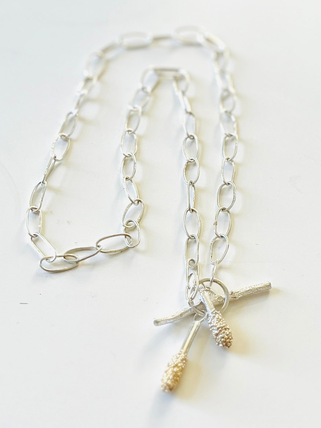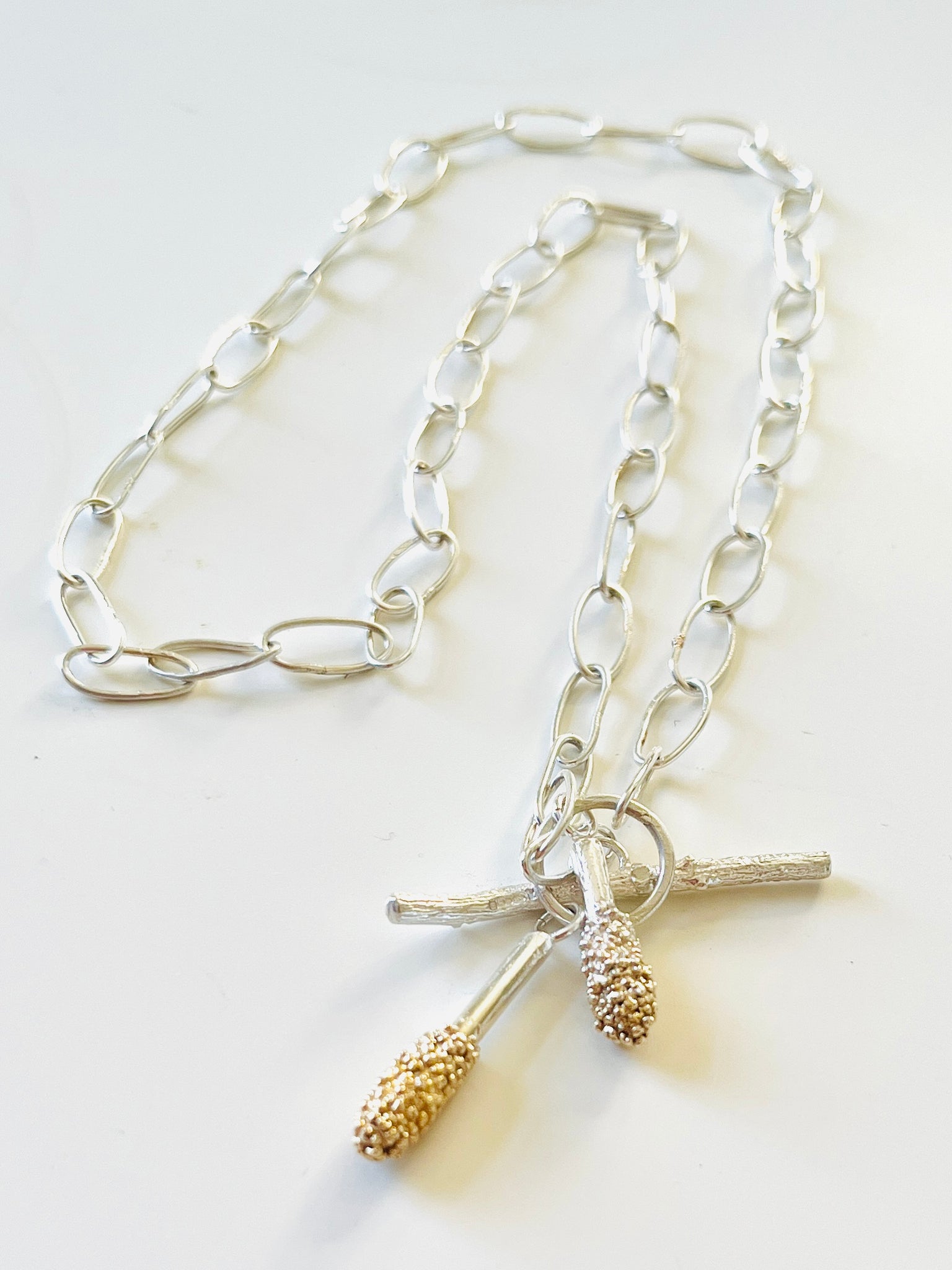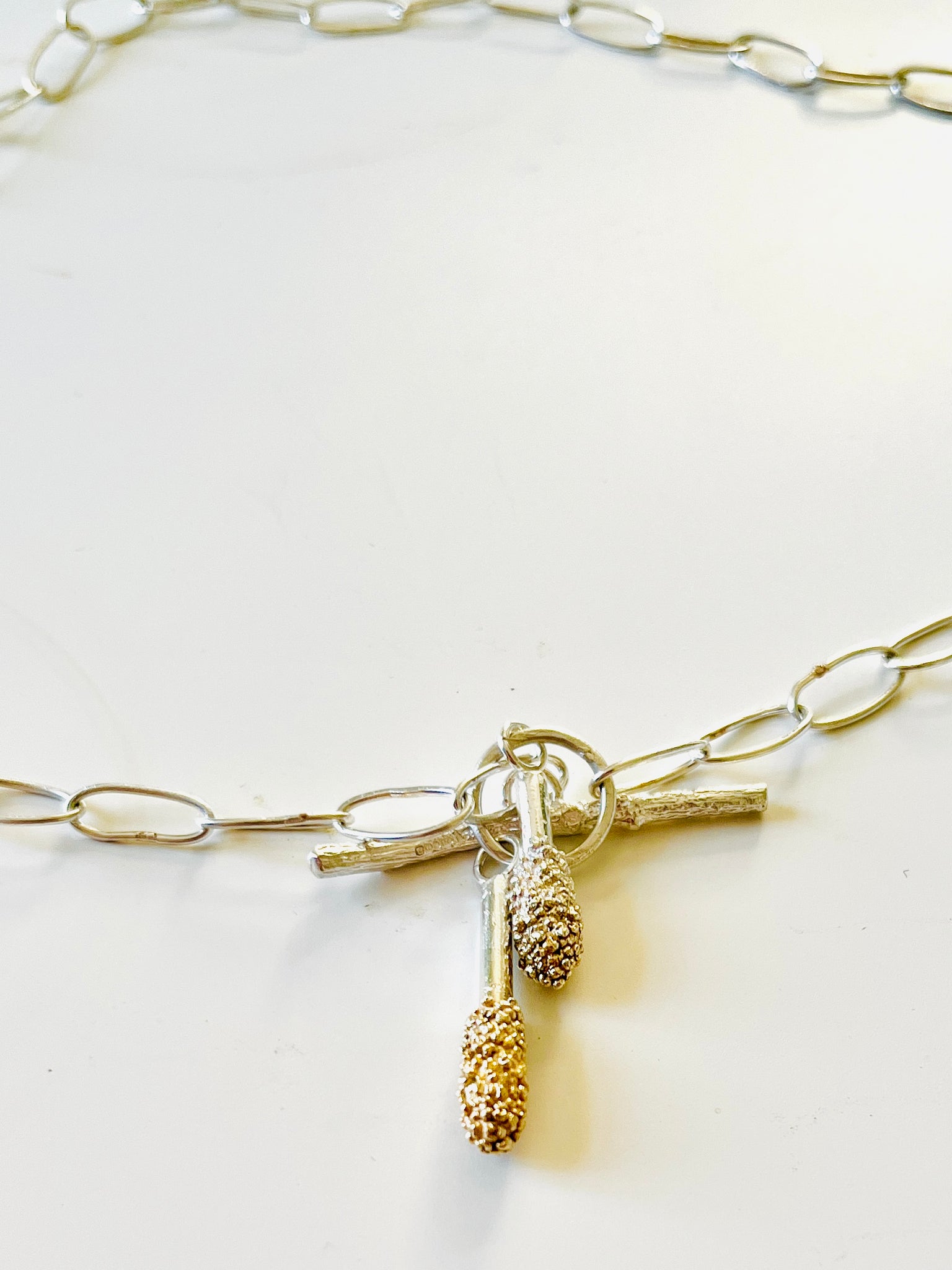 The double pendant features a textured detail and gold plated finish and is attached to a buckle with a casted rose thorn detail. The chain handmade in silver and is 18" long, crafted link by link in Jennie’s Sheffield studio.