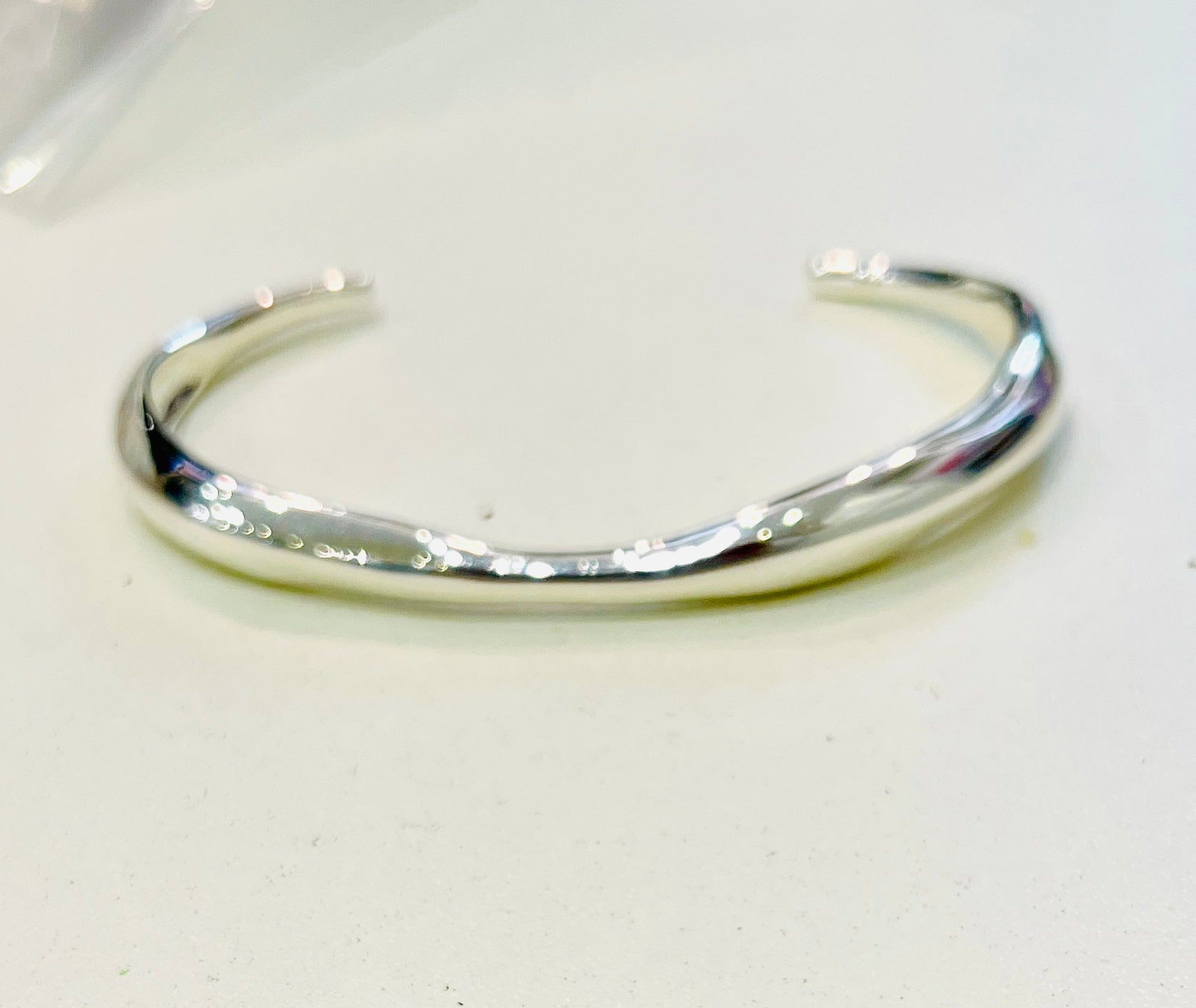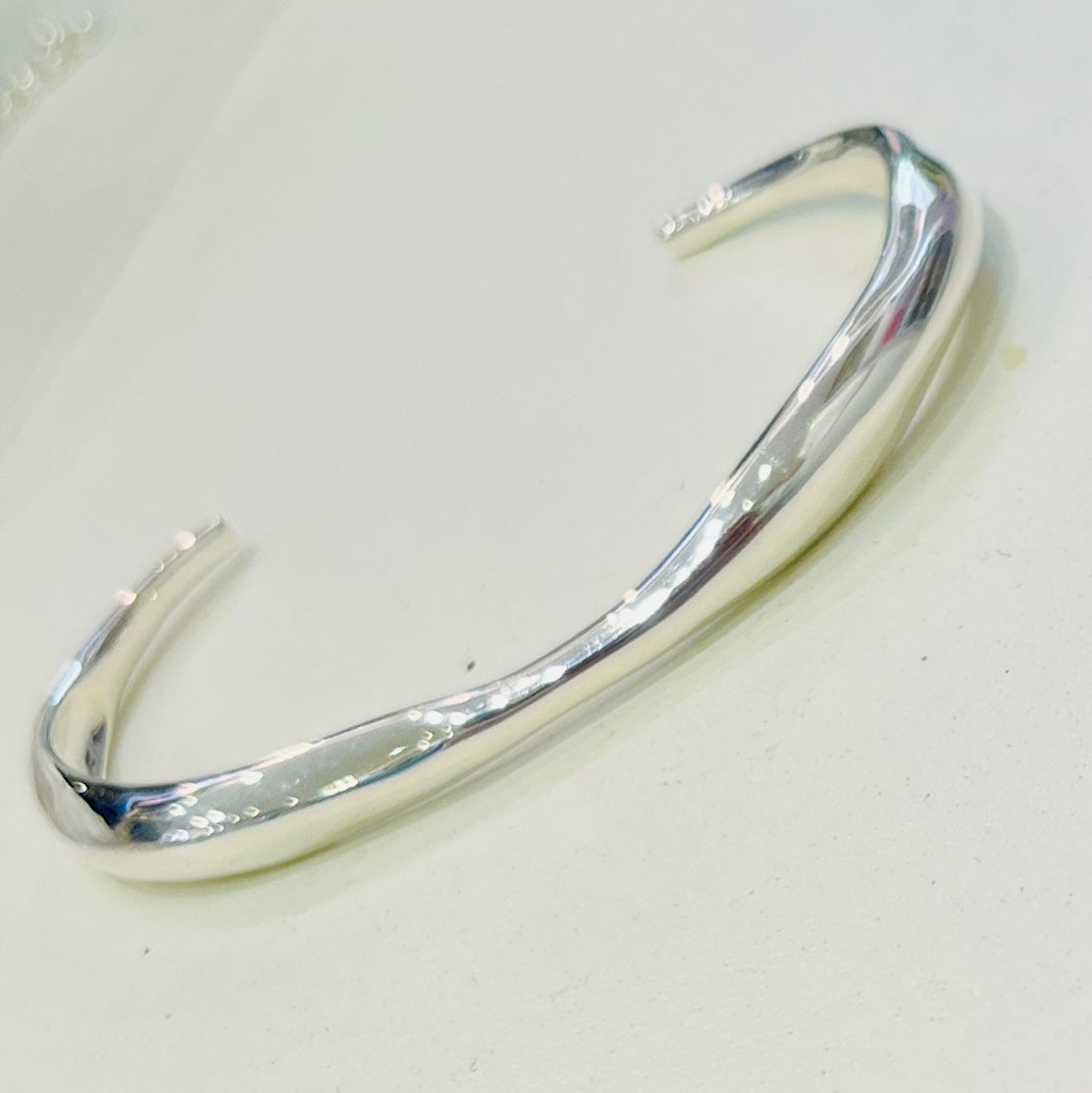 Handcrafted in solid sterling silver, it features a smooth, flowing shape with gentle curves that reflect the light beautifully, creating a sense of movement and grace.