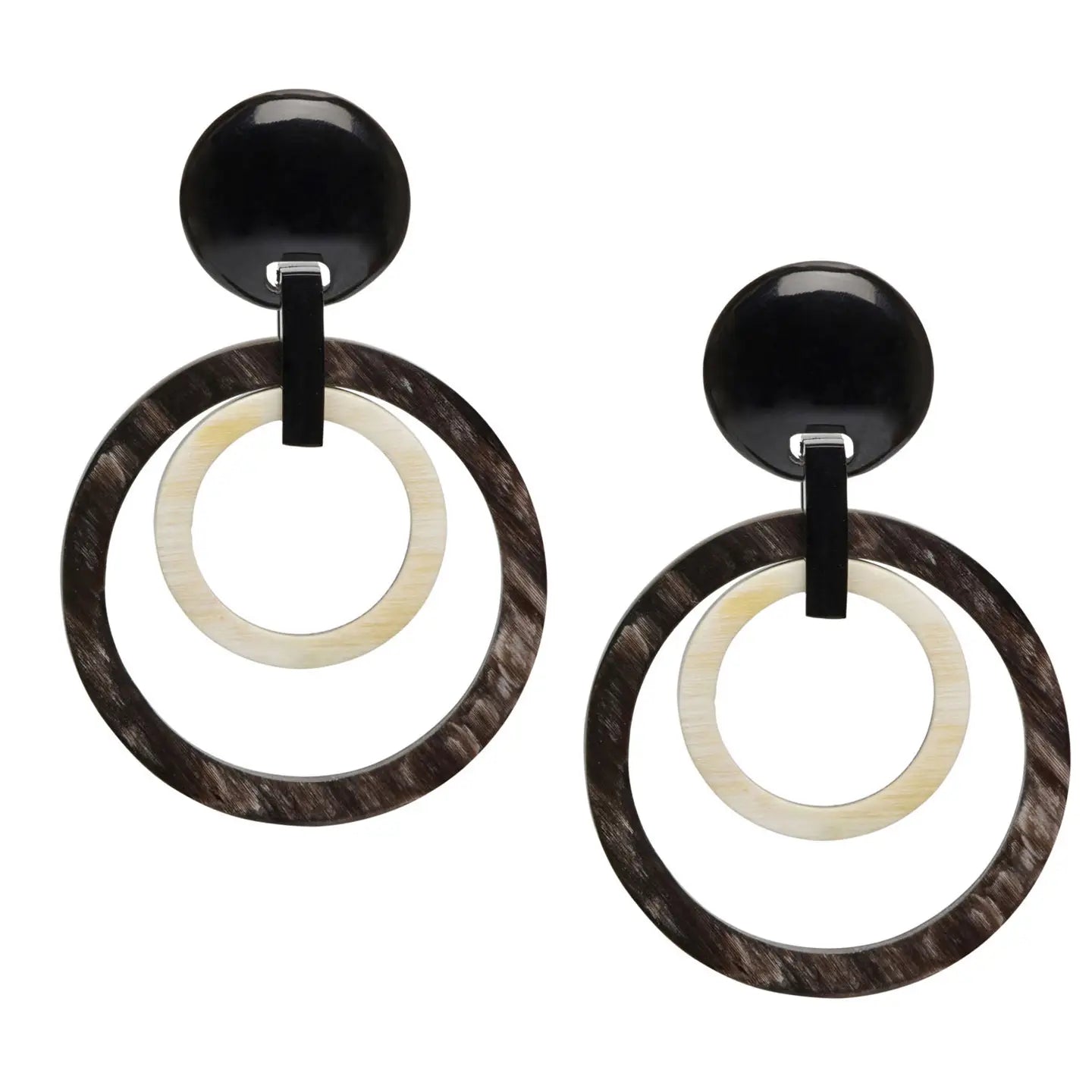Expertly hand crafted by our talented artisan makers these stunning round link earrings are the perfect addition for any statement earring fan. Comprising of two perfectly formed round links of natural black horn and set from a round horn stud, these lovely earrings are extremely lightweight despite their size, so incredibly comfortable to wear. These retro-style white horn earrings will soon be your favourite go-to bold accessory. Style Notes: Wear with a roll-neck knit in the winter for a stylish graphic silhouette or with a wide-brimmed straw hat in the summer for a more sophisticated St Tropez look. However you were them, these earrings will bring the perfect blend of boldness and style to any outfit in any season. Each pair is unique due to the natural variations in horn, ensuring no two pairs are exactly alike.