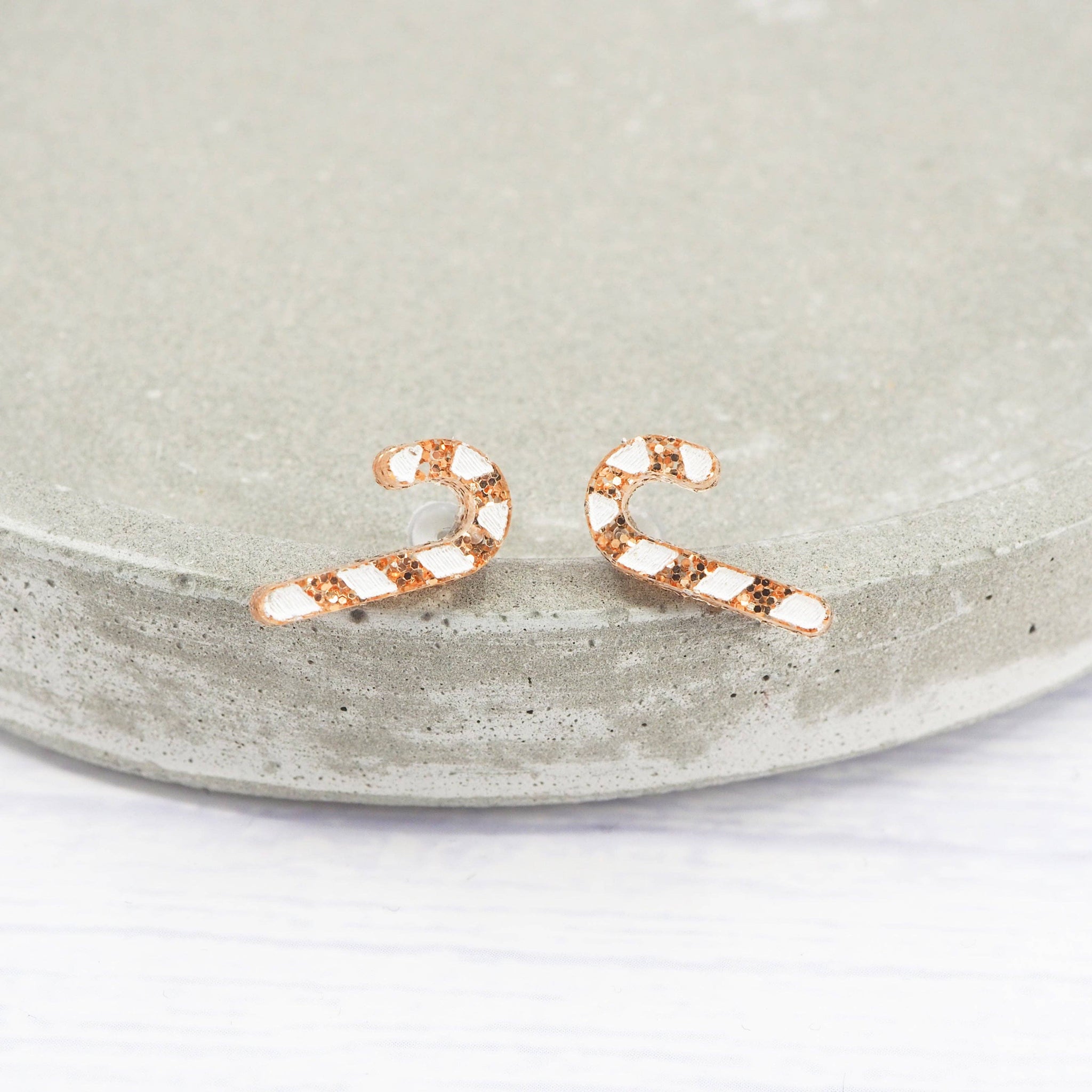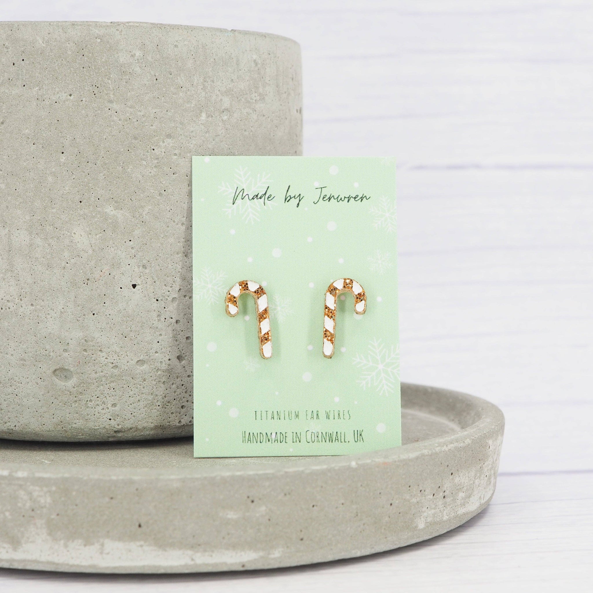 Gold glitter candy cane Christmas studs with 0.7mm titanium ear stems.
